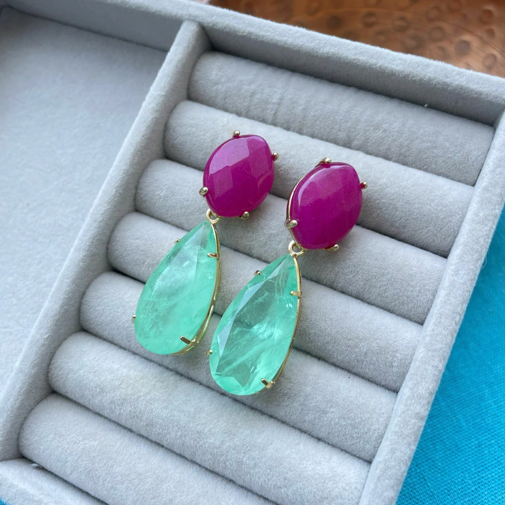 Brinco Fusion Fúcsia é a joia que vai transformar o seu visual! Com uma base deslumbrante em pedra natural na cor fúcsia e uma elegante gota pendurada em pedra fusion verde, este brinco é perfeito para quem deseja um toque de sofisticação e charme.
