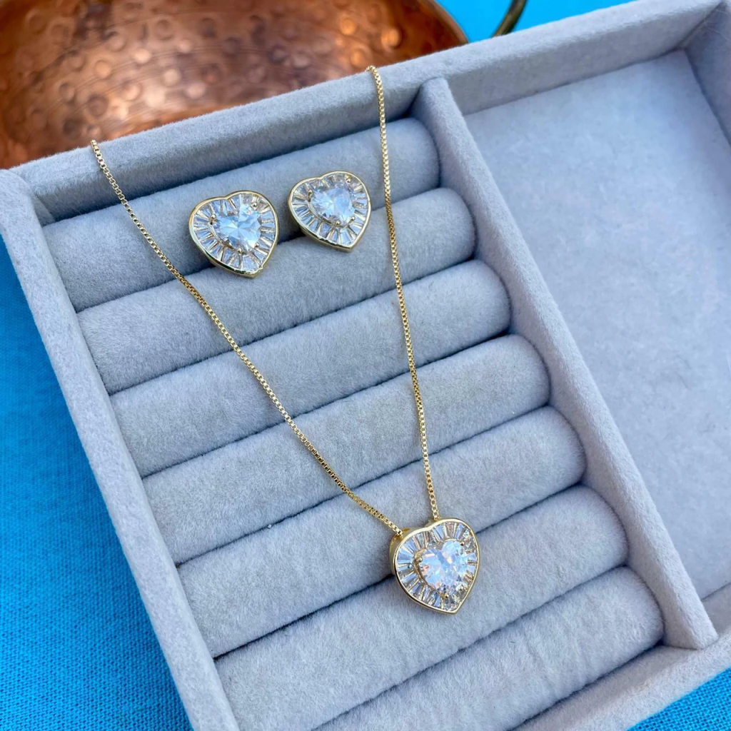 Conjunto Coração Cristal: Um par perfeito que reflete amor e elegância! Este deslumbrante conjunto, que inclui um colar e brinco em formato de coração, é adornado com zirconias cristais que brilham intensamente, realçando sua beleza em qualquer ocasião.