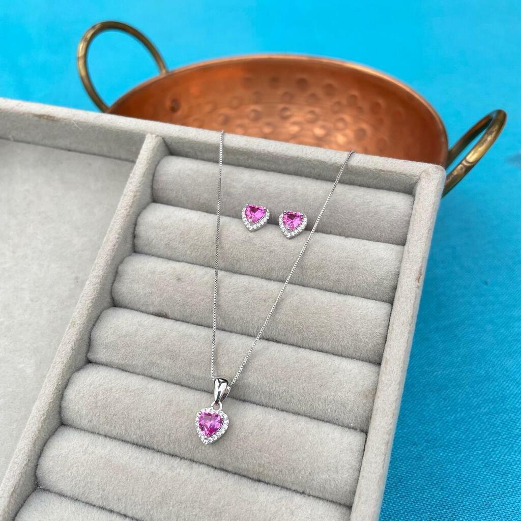 O Conjunto Coração Pink é a escolha perfeita para quem quer adicionar um toque de amor e cor ao seu visual! Composto por um lindo colar e brincos em formato de coração, esse conjunto é delicado e cheio de charme. O banho em ródio branco traz um brilho especial e garante durabilidade, enquanto o tom pink dá um ar divertido e alegre. Ideal para usar em qualquer ocasião, desde um encontro romântico até um passeio descontraído com as amigas. Não fique sem essa peça que é a cara do verão!