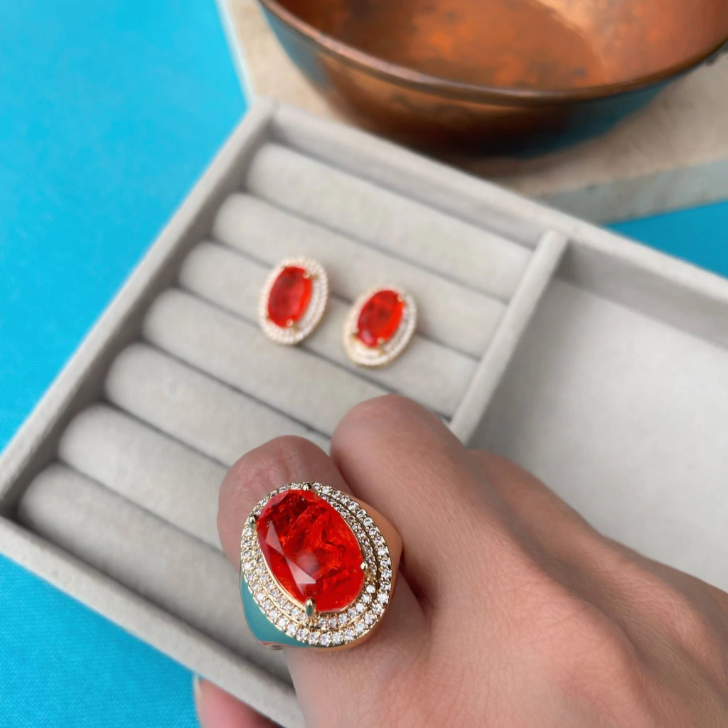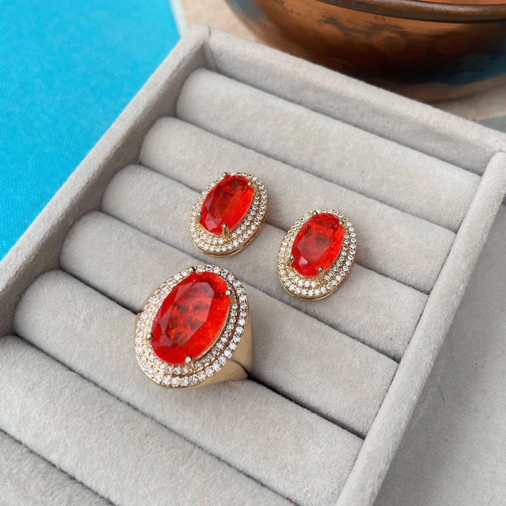 O Conjunto Pedra Fusion Laranja é um símbolo de luxo e sofisticação. Este conjunto de anel e brinco, banhado a ouro, destaca-se pela pedra fusion na vibrante cor laranja, realçada por acabamentos laterais em zircônias cristais que brilham intensamente.